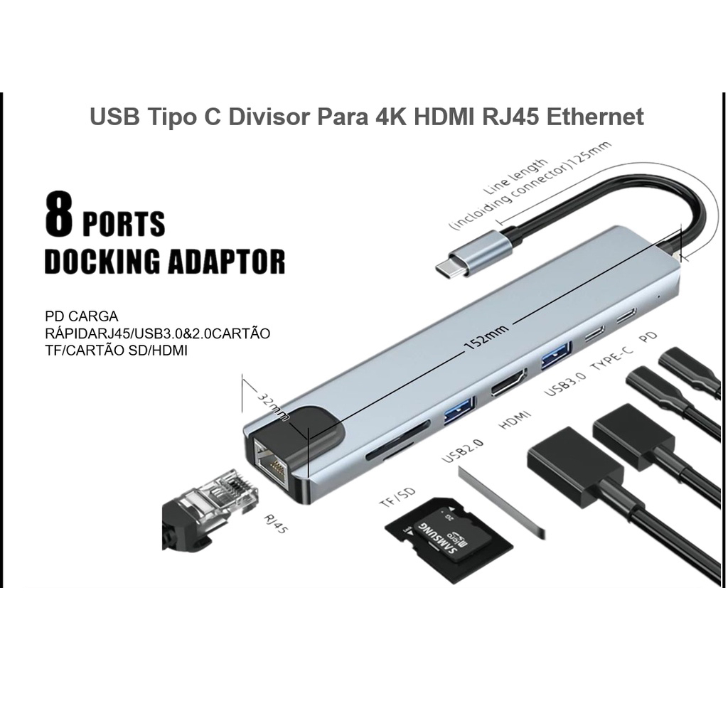 8 In 1 USB Type C Splitter For 4K HDMI RJ45 Ethernet 3.0 TF Card Reader PD Power Distribution Mac-cbook Pro Dock