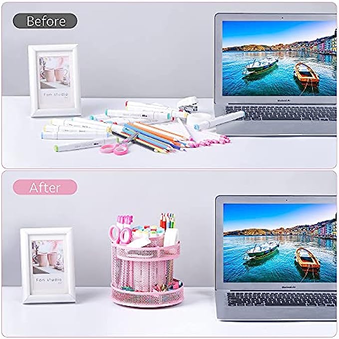【VERSATILE DESIGN】Our desktop pen organizer features 8 separate compartments.Compartments are in various size and shape for convenient & neat storage of pencils,pens,highlighters,markers,scissors,sticky notes,tapes,paper clips and all your office desk accessories or other small personal items such as makeup brushes,nail polishes,lipsticks,etc.The great office supplies organizer allows you to stay away from a messy desktop and get organized.