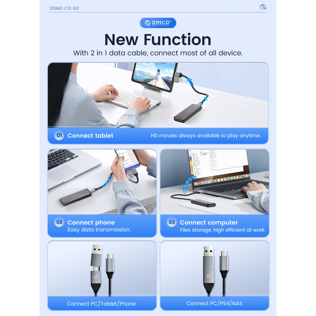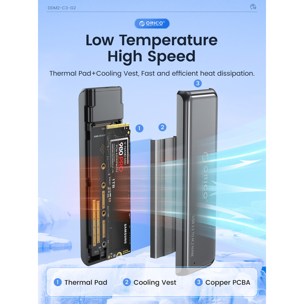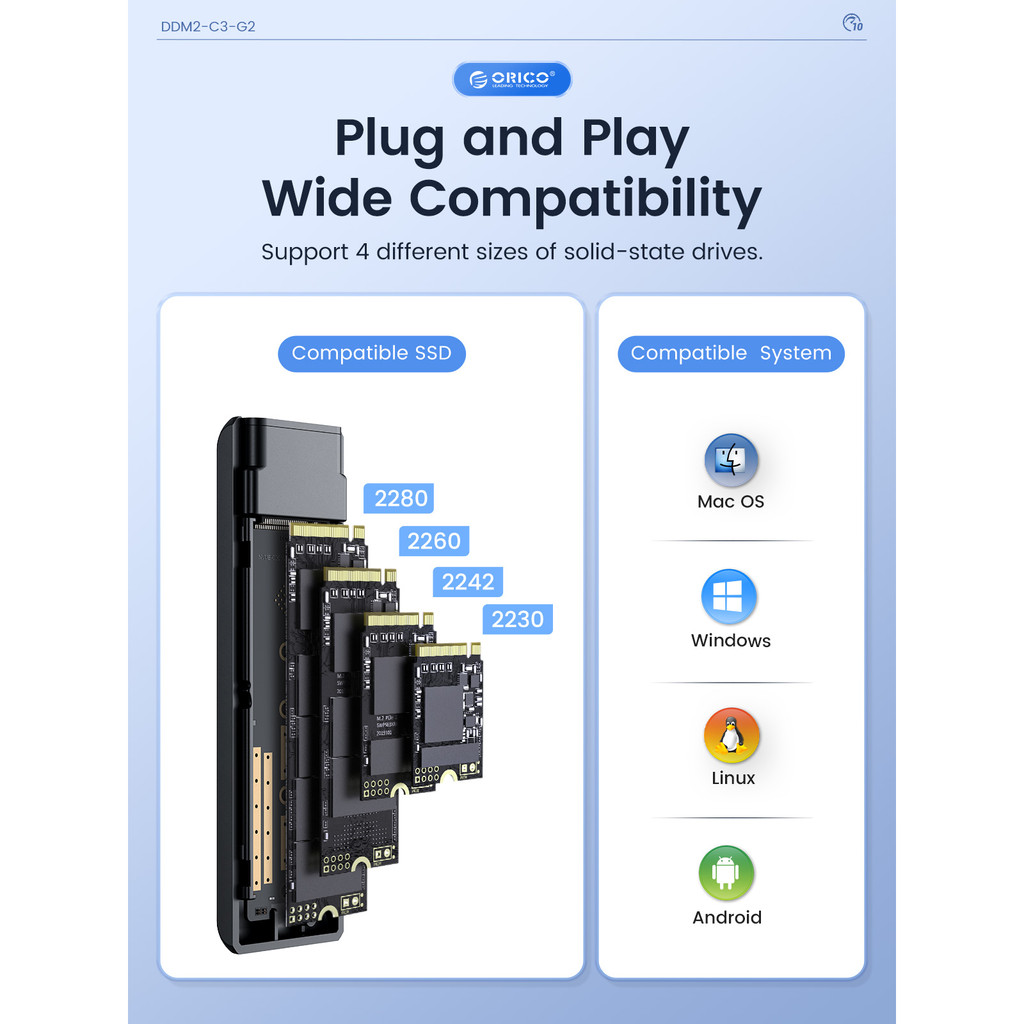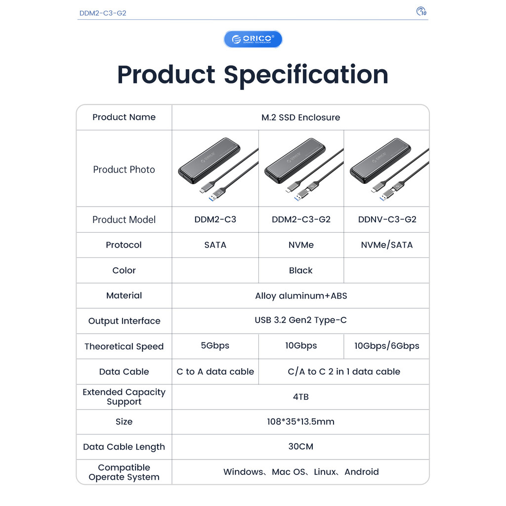 ORICO M.2 NVMe/SATA SSD Enclosure 10Gbps Tool Free M2 SSD Aluminum Enclosure Solid State Drive Case Laptop Computer Accessories (DDM2)