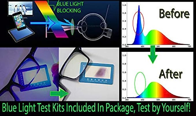 • ✅ Anti Glare Computer Glasses Blue Light Blocking Glasses Made By ANTI-REFLECTIVE COATING UNBREAKABLE RESIN CLEAR LENS FOR ALL SCREEN TYPES TO BLOCK 100% BLUE Light (380nm-450nm) & 100% Harmful UVA UVB UV400 Blocking ★ Water Proof, Anti-static, Dust Free And Easy To Clean