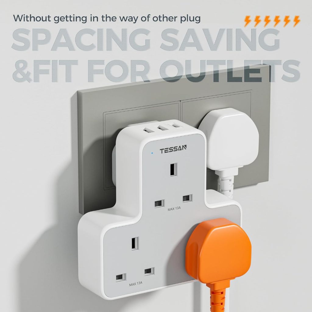 TESSAN Multi Plug Extension Adapter with USB+Type C,Power Extension Socket Adaptor Safety Mark